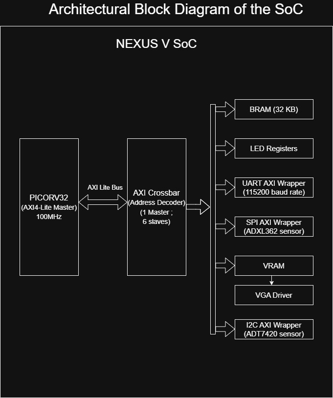 The popularization of the open-source RISC-V Instruction Set Architecture (ISA) has opened up silicon design to many, allowing for the creation of highly customized processors. Nexus-V leverages this ecosystem to build a lightweight, scalable SoC from the ground up, avoiding proprietary, vendor-locked microcontrollers. By implementing standard communication protocols over an AMBA AXI4-Lite interconnect, the SoC serves as a flexible foundation for sensor integration and real-time data processing. The project also bridges the gap between digital hardware design and embedded software engineering by providing a platform where firmware enthusiasts can easily deploy custom programs onto a custom silicon architecture.