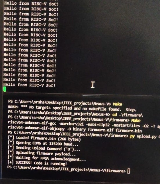The Nexus-V architecture was successfully synthesized, routed, and deployed to the Artix-7 Nexys 4 DDR board. The dual-stage bootloader correctly routed UART payloads to BRAM, allowing continuous software iteration.