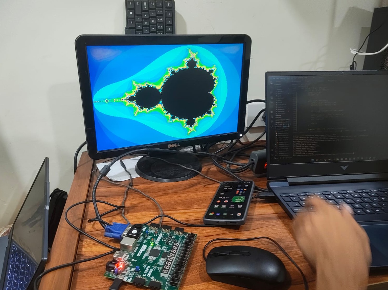 - Driving an external display using a custom VGA controller running on a 25MHz pixel clock.