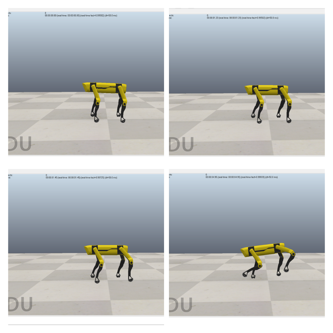 With the inverse kinematics equations and PID control in place, we simulated various locomotion tasks for the quadruped robot. These simulations included: