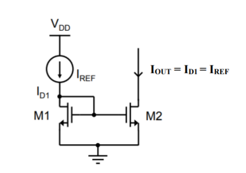 In analog IC design, current mirror structure is one of the most used concepts. It is commonly used to replicate current from one branch of the circuit to another, but it can also be used as a biasing network or as a “pseudo” current source. In the figure, M1 and M2 are MOSFETs with same area process, and VGS, IREF is the current we are trying to mirror and IOUT is the mirrored current. Since the gate of M1 and M2 are shorted, both MOSFETs experience the same overdrive voltage, VGS - VT H.