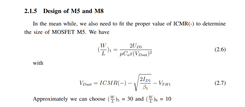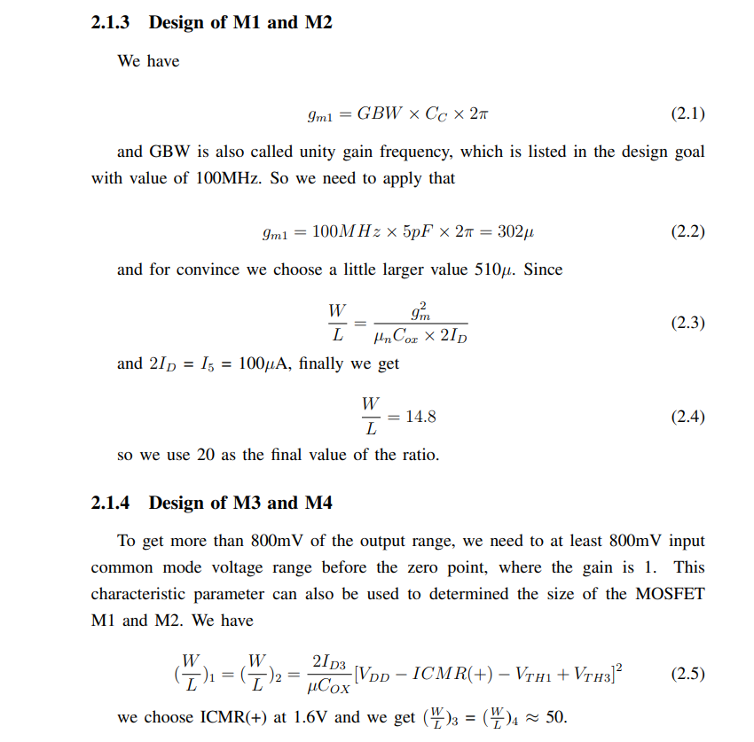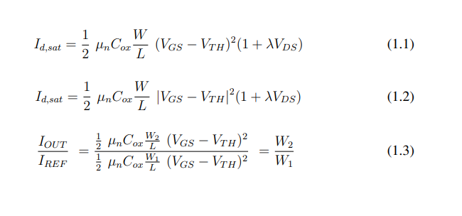 The operation of current mirrors is based on the governing equation of MOSFET current in saturation. Based on the Id,sat, one can see that the current is modeled by the square of overdrive voltage, VOV = VGS–VT H. The first-order operation of a current mirror can be realized as two MOSFET with same process and overdrive voltage, then the current flowing through the MOSFETs should be equivalent if they have the same width and length as shown in Eq. 1.4, assuming negligible channel length modulation. However, this may not always be the case in application. Some non-idealities such as process variation, VDS difference, and VT H mismatch may cause current mismatches.