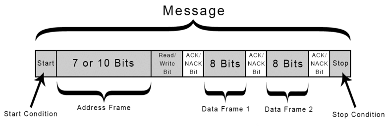 With I2C, data is transferred in messages. Messages are broken up into frames of data. Each message has an address frame that contains the binary address of the slave, and one or more data frames that contain the data being transmitted. The message also includes start and stop conditions, read/write bits, and ACK/NACK bits between each data frame: