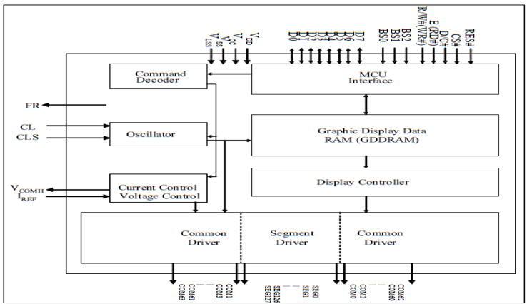 SSD1306 is a single-chip CMOS OLED/PLED driver with controller for organic / polymer light emitting diode dot-matrix graphic display system. It consists of 128 segments and 64commons. This IC is designed for Common Cathode type OLED panel. The SSD1306 embeds with contrast control, display RAM and oscillator, which reduces the number of external components and power consumption. It has 256-step brightness control. Data/Commands are sent from general MCU through the hardware selectable 6800/8000 series compatible Parallel Interface, I2C interface or Serial Peripheral Interface.
